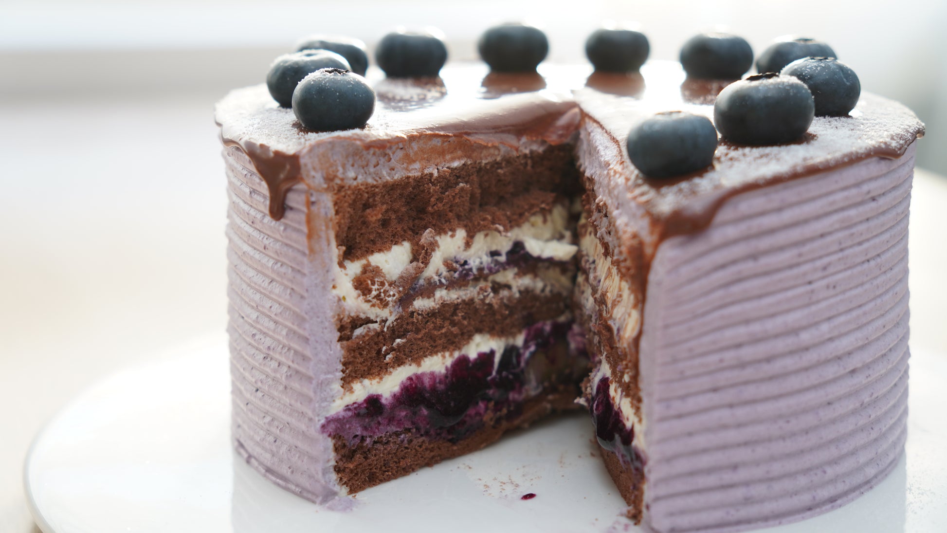 The fluffy and super moist chocolate layer cake with fresh homemade blueberry flavoured cream, finished with a decadent ganache glaze of chocolate and heavy cream creates a perfect combination of flavors.