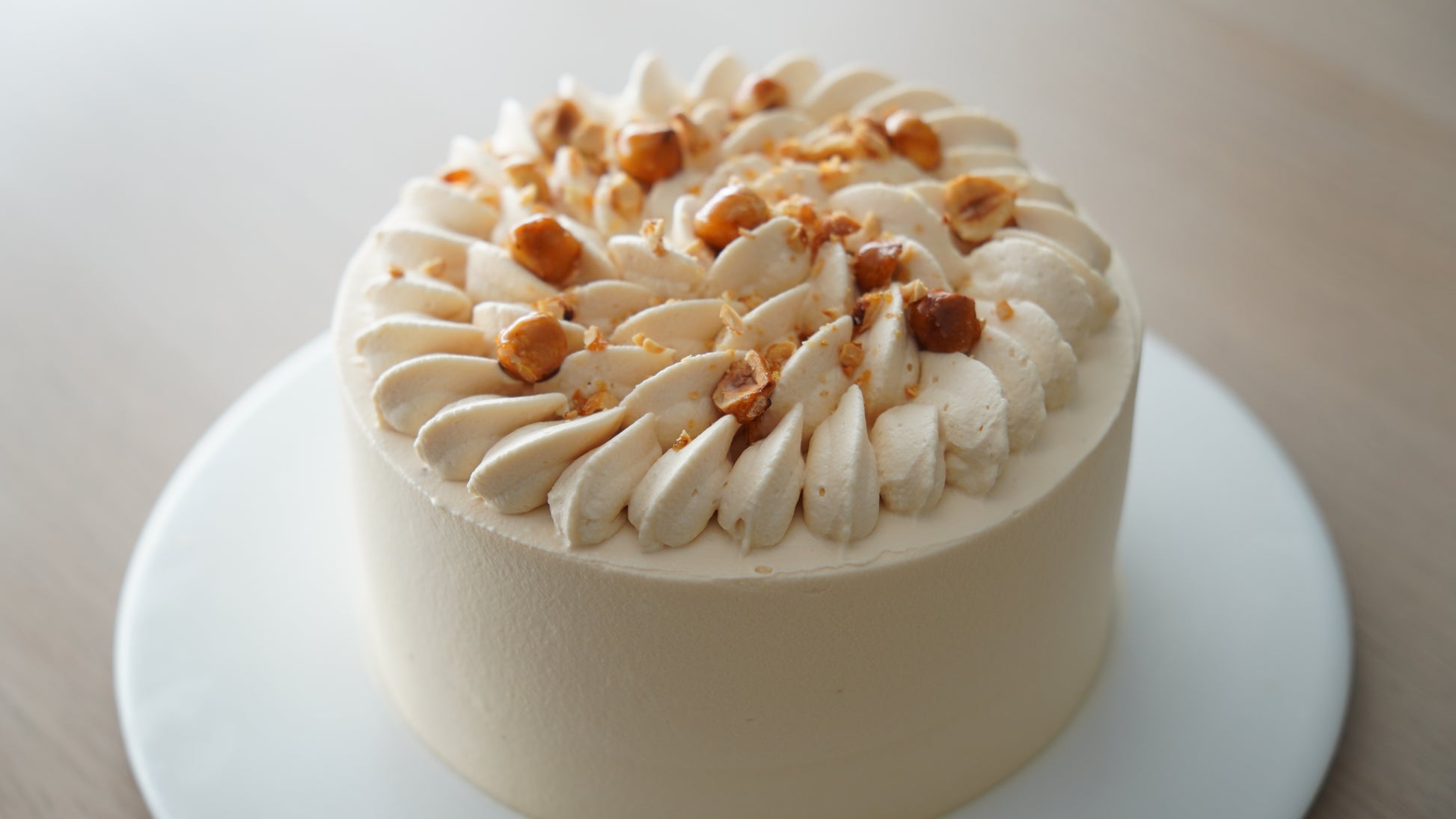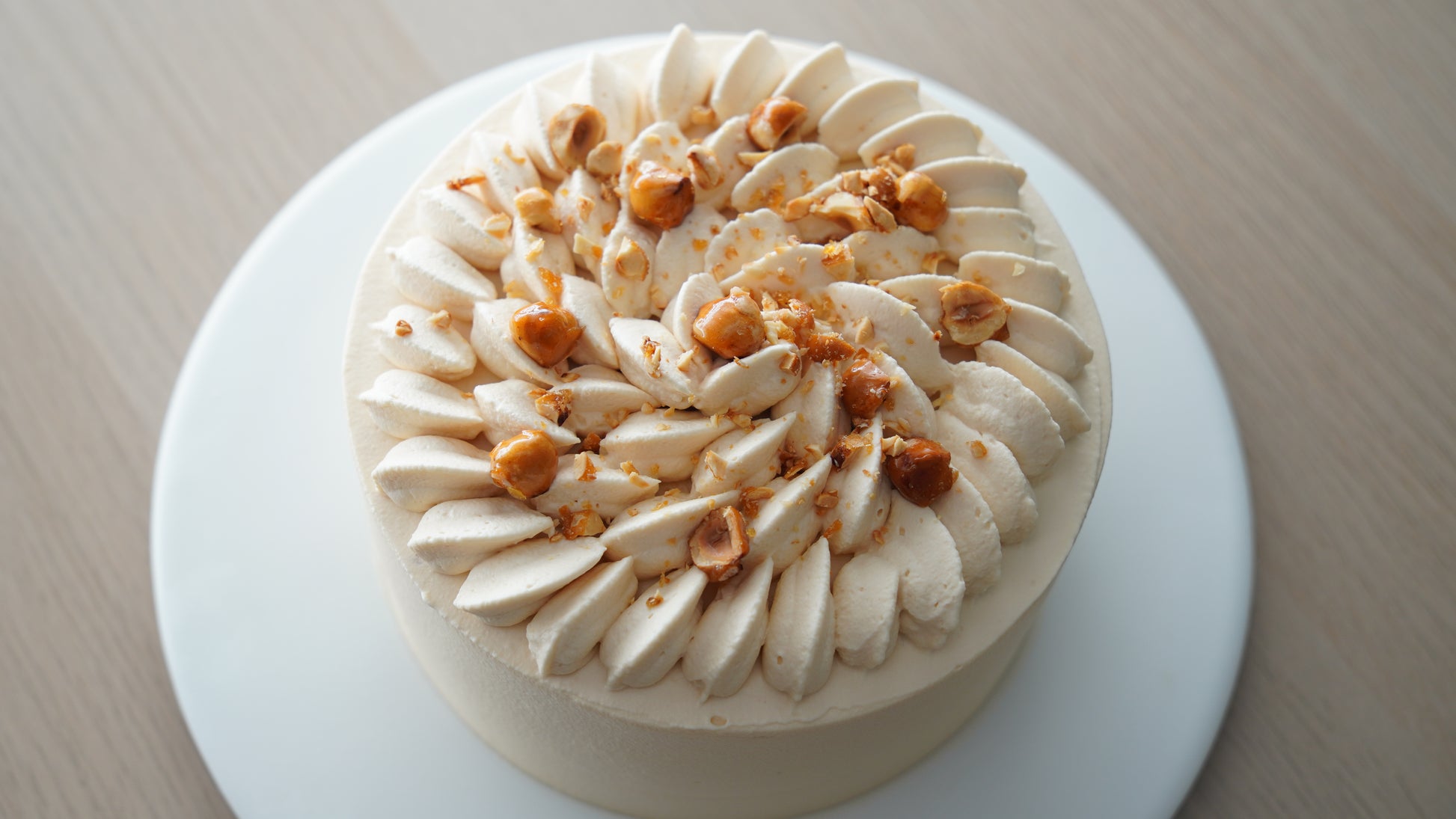 Indulge in the ultimate mocha hazelnut cake, crafted with layers of soft coffee cake and crunchy caramel hazelnuts, covered with homemade sea salt caramel chantilly cream